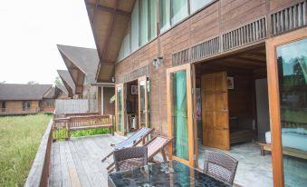 Where to start. This is quite a unique experience. Starting with the most welcoming staff at the main hotel (check out the atrium and koi pools inside WOW) these are wooden villas with beautiful raw stone showers and super clean facilities. A loft space for extra space or futons. The villas are compact but well laid out. A balcony over looks the rice paddy and the wildlife is the most relaxing music sounds . You can hear the fish jumping, frogs singing and other wildlife. Mosquitoes are present so be aware but the bends come with nets and the room has aircon (go across to lotus and get a citron candle to burn) the restaurant outside is super friendly with incredible food and staff. Family of four with some drinks cost 650bht 🥰 I can’t fault our experience and will be using again on each trip. The cost was excellent and included breakfast. Something very unique and close to shops if needed!