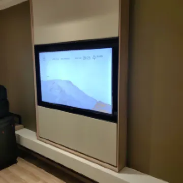 Upon check-in, we were offered tea. The room's TV and internet were excellent; the TV even had live channels and screen casting. When we checked out, they gave us warm water in small, convenient bottles. Parking was easy, and the location was fantastic, right above a mall. Very convenient all around, and easy to park.