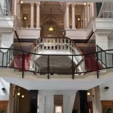 The room size is ample, spacious and bright, with a beautiful view from the window. Breakfast is rich and varied, and the quality is excellent. The lobby, especially, which was converted from the original post office building, is very impressive, and that staircase is absolutely stunning.