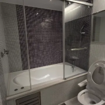 The bathroom is very spacious, with a separate shower and tub, and the toilet and shower are in different areas. There are plenty of TV channels, but the bed and pillows are too soft. Also, if the bathroom door isn't closed, there's a constant strange smell from the pipes.