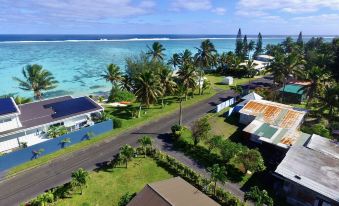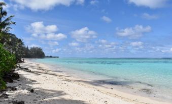 Both studios have large spacious living/sleeping areas, with a modern kitchen off to the side. Dining is out on the shared covered verandah, looking out to the properties beach and your first choice for swimming and snorkeling…30 seconds away! Transportation around the island is conveniently located close by with a bus stop, and buses that generally run every hour around the island. Alternately a 15 minute sunset stroll along the beach will lead you to the “Vaima” restaurant replete with an excellent bar and menu. Coming back along the road will take you past Wigmores superstore for essential household shopping and further along the Yellow Hibiscus Restaurant. Walking the other way will bring you to the Saltwater Cafe (excellent coffee), more great snorkeling and the Queens Representative Home.