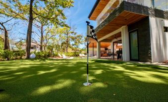 This is a 4 bedroom home, with a gym and private pool. The outdoor area has a large eating area and lounge area, with mini fridge, wine cooler, outside sink, and outdoor glasses and cups. There are lounge chairs throughout the deck and yard for maximum relaxation. There is a small putting green to practice, or just have fun. There is an outdoor shower and toilet for washing off sand after the beach or using the restroom when you are out enjoying the pool.