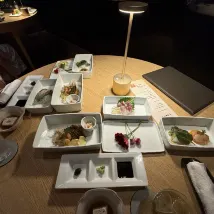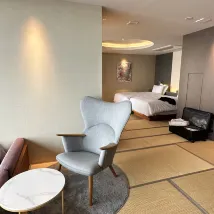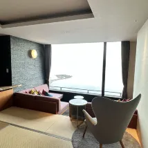 We visited to celebrate a family birthday. It's about an hour and 15 minutes by car from Saga City. It's a great driving route, following the Ariake Sea coastline. Located on the border between Saga and Nagasaki prefectures, the road is lined with oyster huts and crab restaurants! Upon arriving at the hotel, we checked in at the lobby lounge. We were served loquat tea and pudding! There was even a live crab in the lobby, which heightened our expectations. While the building isn't new, the rooms have been renovated and are beautiful. There's plenty of modern art, creating a lovely atmosphere. The room has a variety of lighting options, and the dimming is convenient. The wide windows offer a spectacular view of Mount Unzen-Fugen. The ocean below was also beautiful. Our room, room 603, featured a twin bed, a semi-open-air bath, a shower room, and a U-shaped sofa large enough for four people. The refrigerator was like something you'd find in an old-fashioned inn—it couldn't even fit a 500ml bottle upright. Don't expect great coffee or tea in the room. Instead, there's a lounge with coffee and detox water, which is convenient. The balcony leading out from the lounge also looks spectacular. That said, crab dishes are the main attraction here. For dinner, we chose the crab and Saga beef course. There were four crabs for four people: two males and two females. One crab seemed to have a low female egg count, so we got an extra female. The staff first cut the crab into bite-sized pieces, and then we ate it ourselves! Since 2024 was warm until early December, the crab and oysters had yet to mature. However, the crab was delicious. Personally, the sashimi and carpaccio were excellent! The chefs prepared the crabs at the open counter, so they were very fresh. The sauna and bath on the seventh floor were a bit disappointing. The semi-open-air bath in the room was excellent. Ariake no Yu on the first floor was a little small, but it was a wonderful sauna where you could enjoy the Ariake Sea. The room rate was a little high because it was the end of the year, but I think it's the best hotel to enjoy Takezaki crab. I would like to return if I have the opportunity.