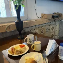 For me the highlight was breakfast. It's a buffet of homely sweet and savoury Georgian dishes made freshly by the owner, including eggs, salads and traditional small, thick pancakes with sour cream.
