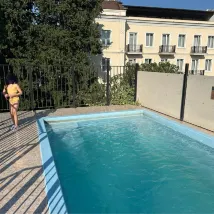 There's parking available, and the metro is about 10 minutes away. Room 409 is very noisy from the street, with cars driving around at night with their mufflers blaring. The room periodically smelled of cigarettes, either from the street (our room was on the 4th floor) or from the ventilation. There's an unpleasant odor in the bathroom. The electrical wiring from the card reader in the room didn't work several times, but the reception staff quickly turned the circuit breakers on and off, and it started working again. There's a small pool nearby, plenty for children, and the staff cleaned it up. The staff is customer-oriented. Breakfast is quite varied; no meat except sausages, plenty of salads.