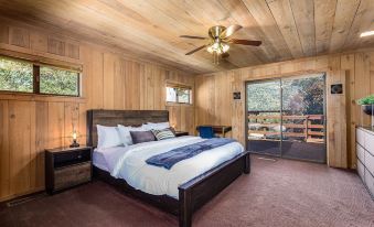 The private main bedroom on the lower level has a king-size bed, an En-Suite bathroom with a shower, and a private slider to the large expansive deck.