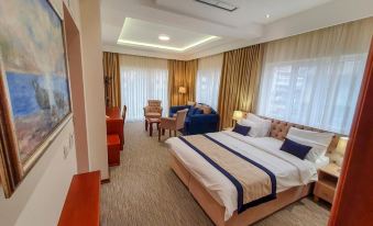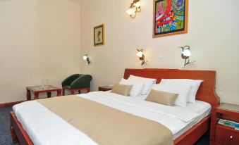 We stayed at this hotel for just one night as part of tour of the Balkans. The decor was very nice and the bathroom was modern with a walk in shower in our room 427 and nice complementary toiletries. Unfortunately the food in the restaurant wasn't as hot as it should be. I appreciate they are catering for lots of people but the fish we tried was drier than dry. At breakfast the fried eggs were all smashed (is this how they have them?) and the bacon very fatty so we settled for cereals and banana.