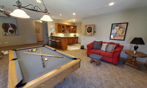 On the Lower Level (walk-out basement) you will find the large Family Room with full size pool table, media area, very nice kitchenette/wet bar, 2 bedrooms and 1 Full Bath. (2 King Beds, 1 Queen, 3 sets of Bunk Beds, and 2 Queen Air Mattresses).