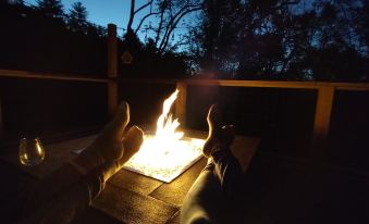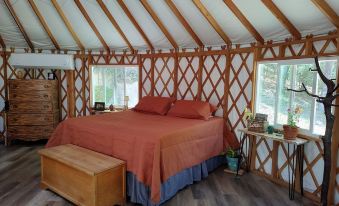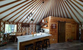 The yurt has a warm and inviting atmosphere. With an open living space, fully equipped kitchen, high domed ceiling and full bathroom you will have all the amenities of a traditional house. The large deck has outdoor seating and a gas fire pit which is perfect for the cool summer nights!