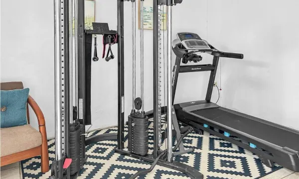An additional full bathroom is located in the gym area, accessible from outside the main house
