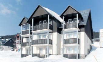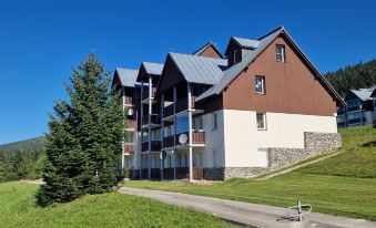 Modern, beautiful apartment block "Horní Mísečky", 1'000 m a.s.l.. 10 m from the centre of Horní Mísečky, 9 km from the centre of Vítkovice, 20 km from the centre of Jilemnice, 50 m from the skiing area. For shared use: property. In the house: storage room for bicycles, storage room for skis. Roofed, parking. Shop 9 km, supermarket 20 km, restaurant 200 m, bus stop "Vítkovice, Horní Mísečky" 200 m. Walking paths from the house 50 m, cycle lane, chair lift 500 m, slopes 50 m, ski rental, ski school 500 m, children's ski school, cross country ski track 100 m, children's playground 500 m. Nearby attractions: Mohyla Hanče a Vrbaty, Zlaté návrší 3 km, Pančavský vodopád, Pramen Labe 5 km, Jilemnice 20 km, Harrachov 35 km. Well-known ski regions can easily be reached: Horní Mísečky, Špindlerův Mlýn, Rokytnice nad Jizerou. Well-known lakes can easily be reached: Vodní nádrž Labská. Hiking paths: Krkonošská magistrála, Bucharova cesta. 2-room apartment on 1st floor. Renovated in 2024: entrance hall. Living room with 1 double sofabed and TV. 1 room with 1 x 2 bunk beds, 1 double bed. Kitchenette (dishwasher, 4 ceramic glass hob hotplates, kettle, freezer, electric coffee machine, Capsules for coffee machine (Nespresso)). Shower/WC. Electric heating, floor heating. Covered balcony. View of the countryside. Facilities: washing machine. Internet (WiFi, free). Please note: suitable for families. Non-smokers only. 1 small pet/ dog allowed.