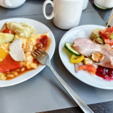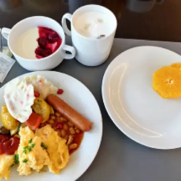 The breakfast selection was extensive, featuring Polish dumplings which tasted quite similar to Chinese flavors, alongside a wide variety of fruits and drinks.