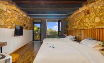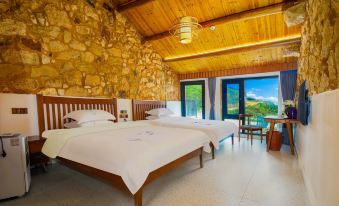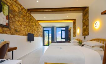 民宿建在上山一個彎道的正中間,正對着海灣,旁邊就是對戒觀景台,我們的房間在靠後一點的位置看不到海,但是也能看到漁村港灣,朋友訂的一世界,正對着大海,景色絕了。房間四周是石頭牆壁,很有特色,房間很乾爽整潔,一點不潮濕,住了兩晚都睡的很好,隔音什麼的我覺得也很OK,大堂的裝修也很好看,裏面還有很多的大石頭,早餐也很豐盛,還吃到了嵌糕。