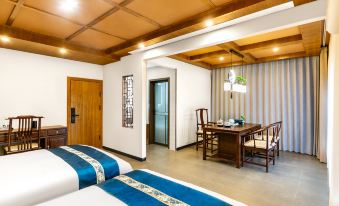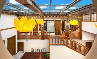 民宿的禪意從踏入木門的那一刻便漫了出來。原木色的連廊襯着暖黃的燈籠光暈,牆上的禪意水墨與角落的陶罐枝椏造景相映成趣,每一步都像走進了靜謐的東方美學畫卷。公區的禪茶室裏,古樸茶器旁竟巧妙擺放着,沉香裊裊,這份別緻設計讓人眼前一亮。房間更是將禪意與舒適拿捏得恰到好處:柚木色傢俱線條簡約,暖光透過紗簾灑在棉麻床品上,而智能面板輕輕一觸就能調節燈光與窗簾,傳統韻味裏藏着不動聲色的時尚感。