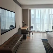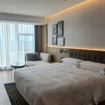 Upon entering the hotel, the crystal chandelier was stunning. Angela, the front desk lady, was very friendly and helpful, and check-in was quick and easy. The room we were assigned had a perfect orientation, flooded with sunlight, and felt very comfortable. Ordering late-night snacks from the hotel was also very convenient; they were delivered to our door via a robot. The hotel also offers à la carte service, and the noodles on the menu were delicious! The room was also quite spacious, and best of all, they even offered luggage storage after check-out! Excellent!