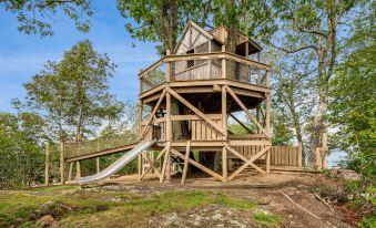 Everyone loves the privacy of three-level living, each floor featuring its own generously proportioned sitting area, sleeping quarters, and full bath. Walk through the front door into a spacious great room with large sliding doors that open to a deck with fantastic views of Pisgah National Forest. The sun pours into the open design floor plan, giving the space a peaceful and motivating daytime atmosphere. You will notice handcrafted elements throughout the home, such as the hardwood floors and the custom stone fireplace, including a hand-carved mantle with a black bear motif. The modern farmhouse decor will also heighten your cabin experience, with fun elements like LED artwork and a mobile bar set with wine glasses, and thoughtful touches like velvety throw blankets on each bed and couch. With the fully-equipped kitchen and a gas grill, there is plenty of room to cook for a group, and the family dining table at the center of the home is a great gathering space. The main level master suite features a king bed and a spa-like en suite bath with a clawfoot soaking tub. On the upper level, families can make themselves at home with a twin-over-full bunk bed in the loft and two additional bedrooms. One of the bedrooms features a built-in desk with a view, a dreamy place to stay connected. The lower-level den is perfect for evening entertainment with a shuffleboard table for game time, a 75-inch TV, and a double-sided fireplace that passes through from the inside to the hot tub on the deck. Several amenities set this home apart as being ideal for families: three living areas, double decks, a TV in every bedroom, and a large laundry area. Pack your bags and head for Whispering Falls, a memorable mountain destination that is big enough for the whole family!