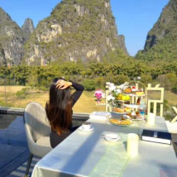This hotel perfectly matches my aesthetic. Sipping tea on the lounge chair while enjoying the mountain view is so therapeutic. Plus, there's an outdoor movie screening at night! It's just a 10-minute bike ride to the Yulong River bamboo raft pier. No need to wake up early for your itinerary, it's the ultimate choice for a relaxing getaway.