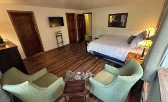 - Open upstairs third-floor family/living/kitchen area and bath, with sofa bed/couch, wood and gas burning fireplace , and balcony.