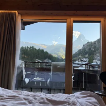We booked a Matterhorn view room for our family trip to Zermatt. Luckily, we were upgraded, and with clear skies, the view of the Matterhorn from our room was breathtaking. The starry sky was twinkling beautifully, and the sunrise was magnificent, making for a wonderful memory.