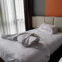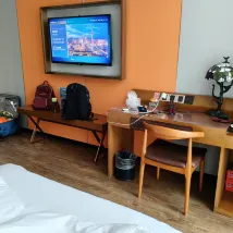 The hotel is very close to the border crossing, which made immigration incredibly convenient. The room and bed were surprisingly spacious, much larger than anticipated, and the overall environment was quite pleasant. The service was also excellent, with all the staff members being very friendly and helpful. I didn't take any dedicated photos – this was just a quick snap before I left – but you can clearly see how large the room is and that there's plenty of storage space for your belongings.