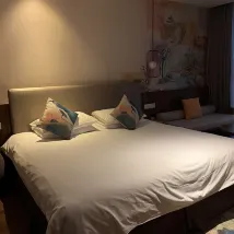 Nice and very comfortable bed. Easy to get in and out. The service at the counter is very good. Parking is also convenient. Ordering takeout is also convenient. The hotel bed is large and the decoration is elegant. It is suitable for family travel.