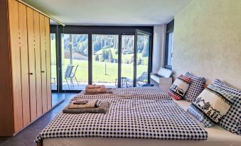 Blankenburg 1 km from Zweisimmen: Beautiful, very comfortable apartment house, 3 storeys, built in 2021. In a sunny position in the residential district. In the house: storage room for bicycles, central heating system, washing machine, tumble dryer (for shared use, extra). Communal covered parking. Shop 1.5 km, supermarket 1.5 km, restaurant 500 m, bus stop "Zweisimen Bahnhof" 1.7 km, railway station "Blankenburg" 600 m, outdoor swimming pool 2.7 km. Tennis 2.7 km, walking paths from the house 10 m, gondola lift 1.4 km, skisport facilities 3 km. Well-known ski regions can easily be reached: Zweisimmen - Rinderberg 1.5 km, Lenk 15 km. Please note: main road close by. Airfield close by. "Greenview", 2-room apartment 62 m2, on the ground floor, south-west facing position. Spacious and bright, very comfortable and cosy furnishings: open living/sleeping room with 1 sofabed, dining table and cable TV. Exit to the terrace. 1 room with 1 double bed (2 x 90 cm, length 200 cm), shower/WC. Exit to the terrace. Open kitchen (oven, dishwasher, 4 induction hot plates, toaster, kettle, microwave, electric coffee machine, Capsules for coffee machine (Nespresso) extra, raclette grill, fondue Set (cheese)). Shower/WC. Solar energy heating, underfloor heating. Solar power. Large terrace. Terrace furniture. Marvellous view of the mountains and the countryside. Facilities: Internet (WiFi, free). Parking (roofed, 1 car). E-charging station. Please note: non-smokers only. 1 small pet/ dog allowed.