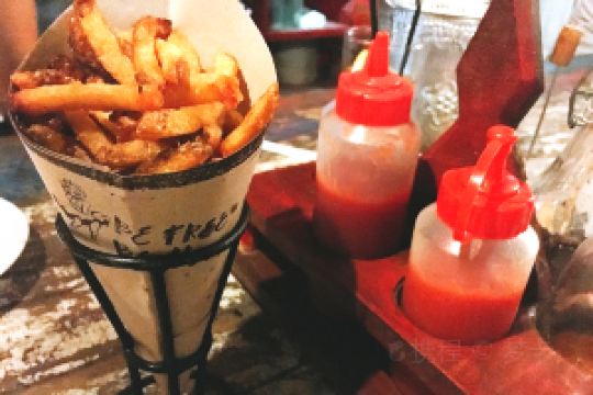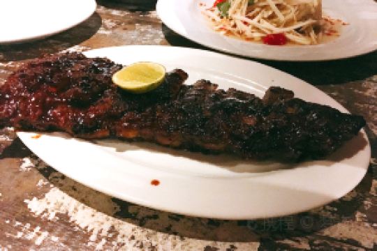 It's an authentic American meal. The grilled ribs are good. The three of us ordered a portion of grilled ribs. The omelette rice and satay skewers are also delicious. It's economical and many people eat there, mainly Europeans and Americans.