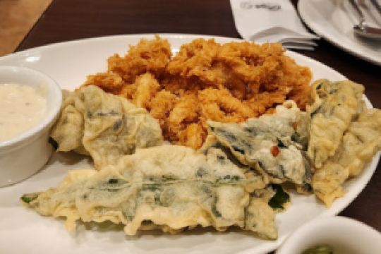 Gerry’s Grill is a restaurant with local characteristics. It has many branches in the Philippines and has a good reputation. The key is that this restaurant has a high cost-effectiveness. We ordered a salad, a grilled squid, and two main dishes. We were very full. With the service charge, it was only 1,200 pesos, or 160-170 yuan. Deep-sea fish salad is their original dish, so we ordered one. The taste is a bit sour, the fish is very soft and melts in the mouth. The price of this salad is also very expensive, it seems to cost more than 300 pesos. I believe the variety of fish must be very precious. Grilled squid is a must-order dish for every diner. A squid is 500g and costs more than 400 pesos. The amount is definitely enough for two people. The most important thing is that the taste is also good. It seems to have added honey, a little sweet, plus the salad in front, it is very appetizing. As for the main dish, we didn’t know its quantity at first, so we ordered 2 servings, one seafood fried rice and one seafood fried noodles. The rice in the fried rice is quite amazing.