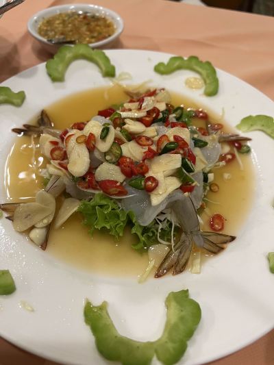 I drove a motorbike from Patong Beach to King Power, and found such a stylish Thai restaurant after shopping. It retains the original style from inside to outside, with green glass, retro chandeliers, wooden stairs, and sparrows flying in to find food. There are some black and white photos of family members hanging on the wall, which have a strong sense of history, and there are also photos of the king. I ordered an unknown steamed fish, a shrimp cake with big shrimps, and a seafood fried rice. The taste is very Thai. I personally like it. It is much better than those seafood feasts that are similar to those on the edge of Patong Beach.