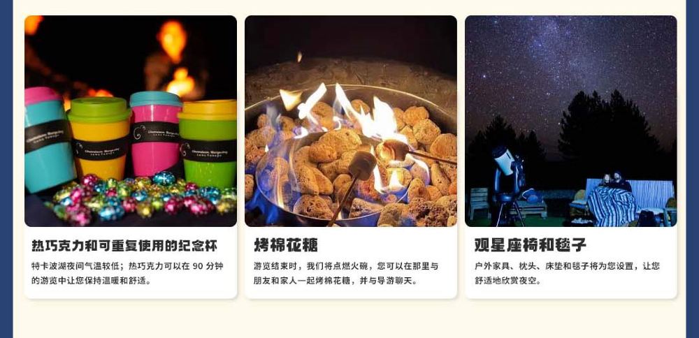 Hot beverages. Choose from hot chocolate and tea. With lower nighttime temperatures at Lake Tekapo, the hot drinks will keep you warm during the 90-minute tour.