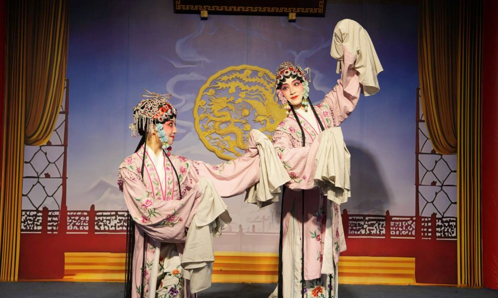 - On stage, two Sichuan Opera Dan role performers, dressed in pink costumes embroidered with intricate flowers and wearing delicate headwear, are showcasing the traditional "water sleeve" skill of Sichuan Opera. As their water sleeves flutter, they fully display the grace and subtlety of Sichuan Opera performances.