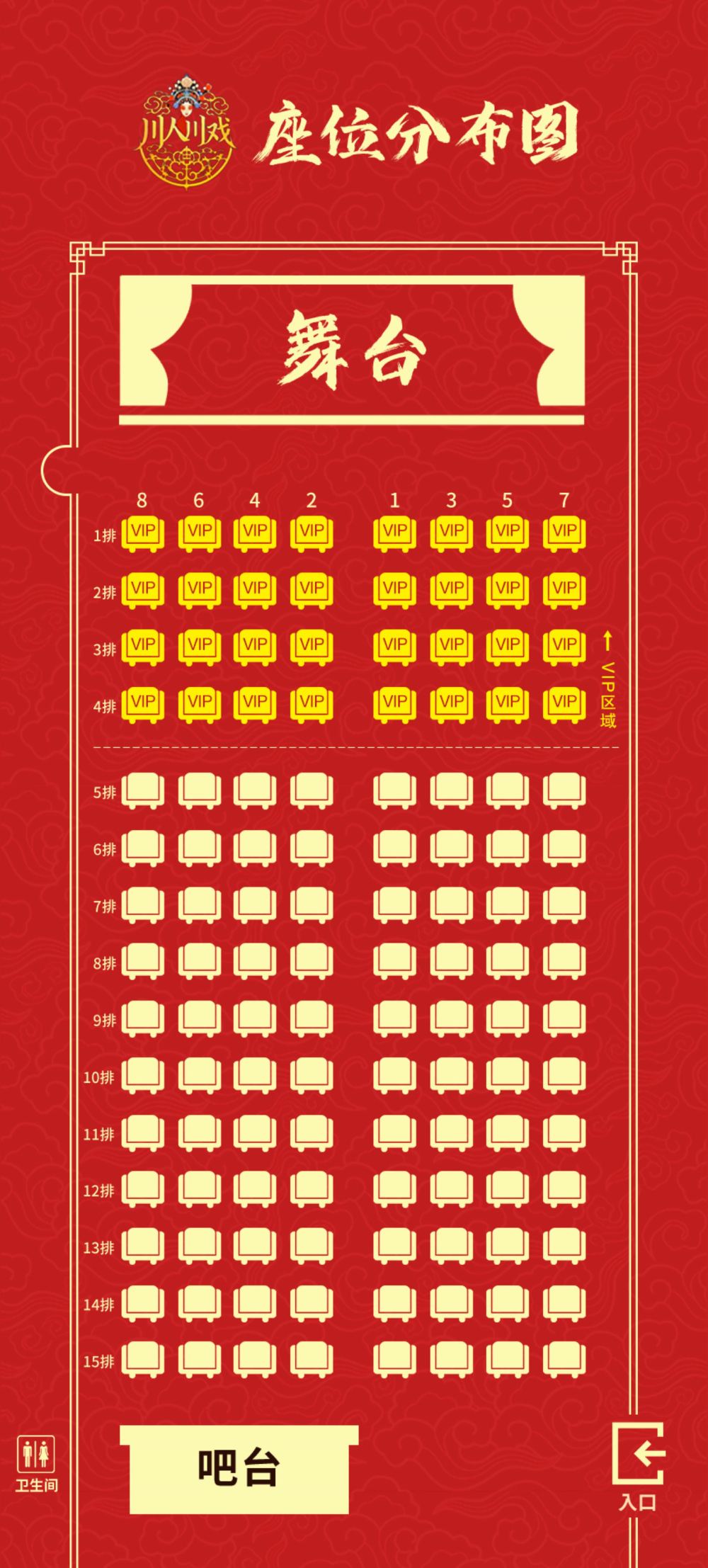 - Seat map, rows 1–4 are VIP seats, rows 5–15 are regular seats
