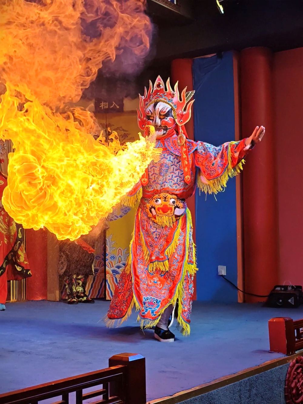 - Fire-spitting is a classic Sichuan Opera stunt where performers use special techniques to breathe fire from their mouths. It's often used to portray the majestic aura of deities or generals, requiring both exquisite skill from the actors and mastery of safe operating methods. It's a highly impactful segment in Sichuan Opera performances.