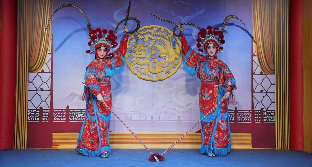 - Their costumes and performances showcase the heroic spirit of Sichuan Opera's martial female roles, while the traditional stage elements in the background highlight the classical charm of Sichuan Opera, vividly presenting the excitement and grandeur of its martial arts performances.