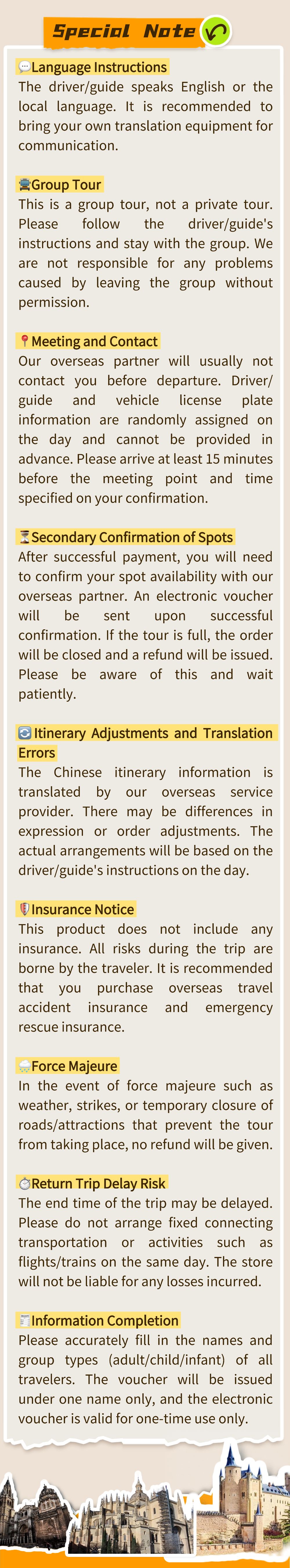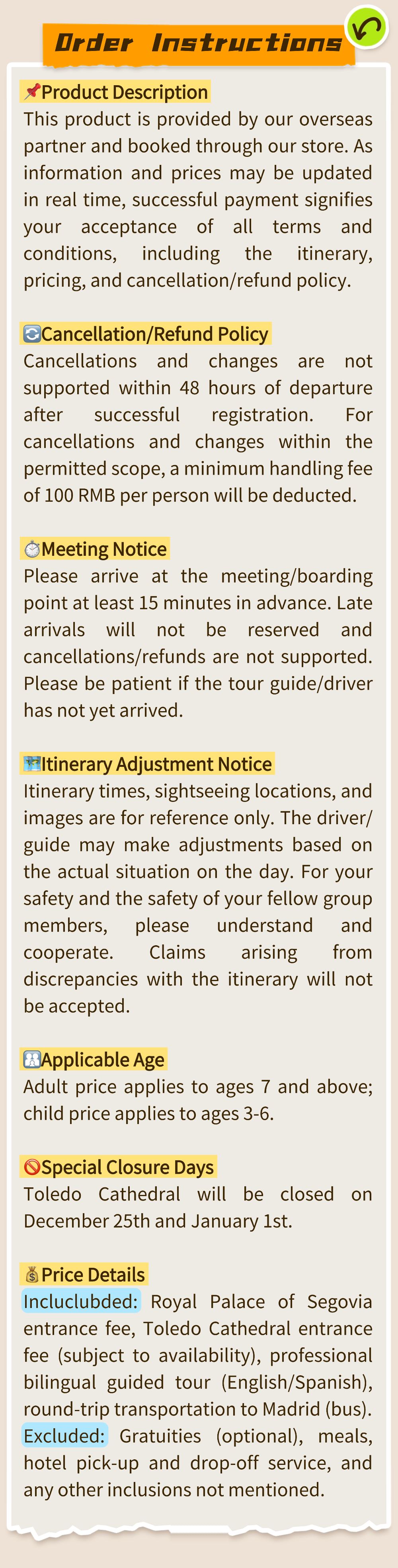 1. This product is provided by our overseas partner, and we handle the booking on your behalf. Due to real-time updates to product information and market price fluctuations, the information displayed may differ from what you see when you book. By successfully placing and paying for your order, you acknowledge that you have read, understood, and accepted the itinerary, pricing details, refund and cancellation policy, and other instructions.