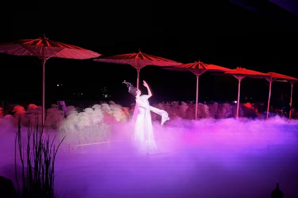 - Purple mist envelops the night stage as white-clad dancers gracefully twirl their sleeves, forming a striking contrast with red umbrellas and reed clusters. The dreamy interplay of light and shadow creates an ethereal court dance performance.