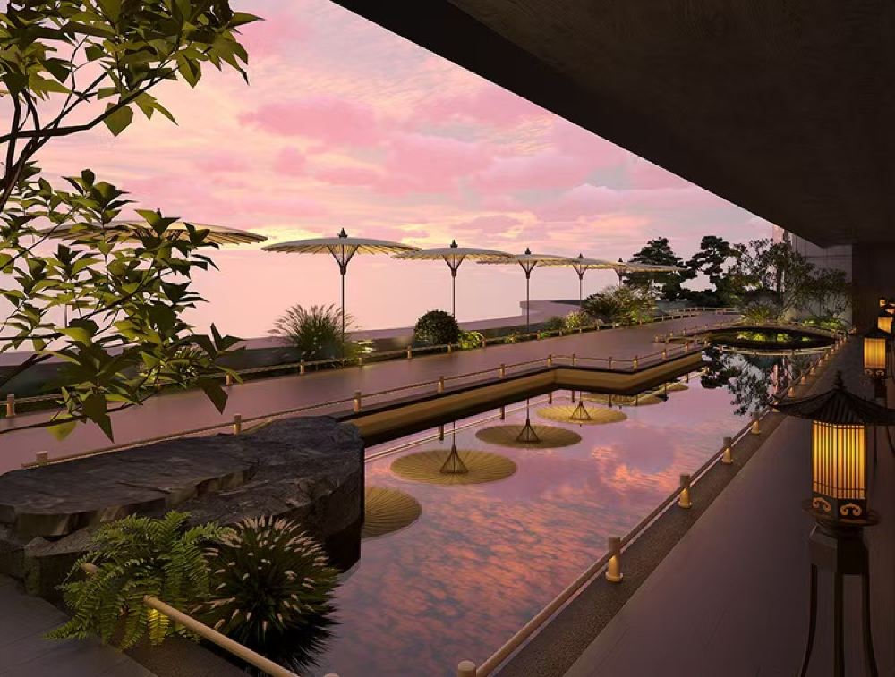 - Pink clouds paint the sky as the courtyard's winding pond mirrors drifting clouds. Arrayed lanterns and artfully placed stones blend light and nature, creating an elegant Chinese retreat of serene tranquility.