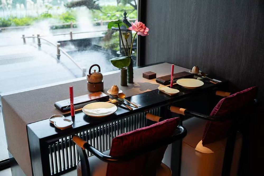 - Designed following Southern Song Dynasty court rituals, this exclusive private dining room hidden in Hangzhou's elegant surroundings shields you from the bustle. Vermilion pillars reflect palace lanterns, while golden brocade drapes enclose an intimate space. Open the window to glimpse misty lakes and mountains, perfectly embodying Jiangnan's refined elegance and imperial grandeur.