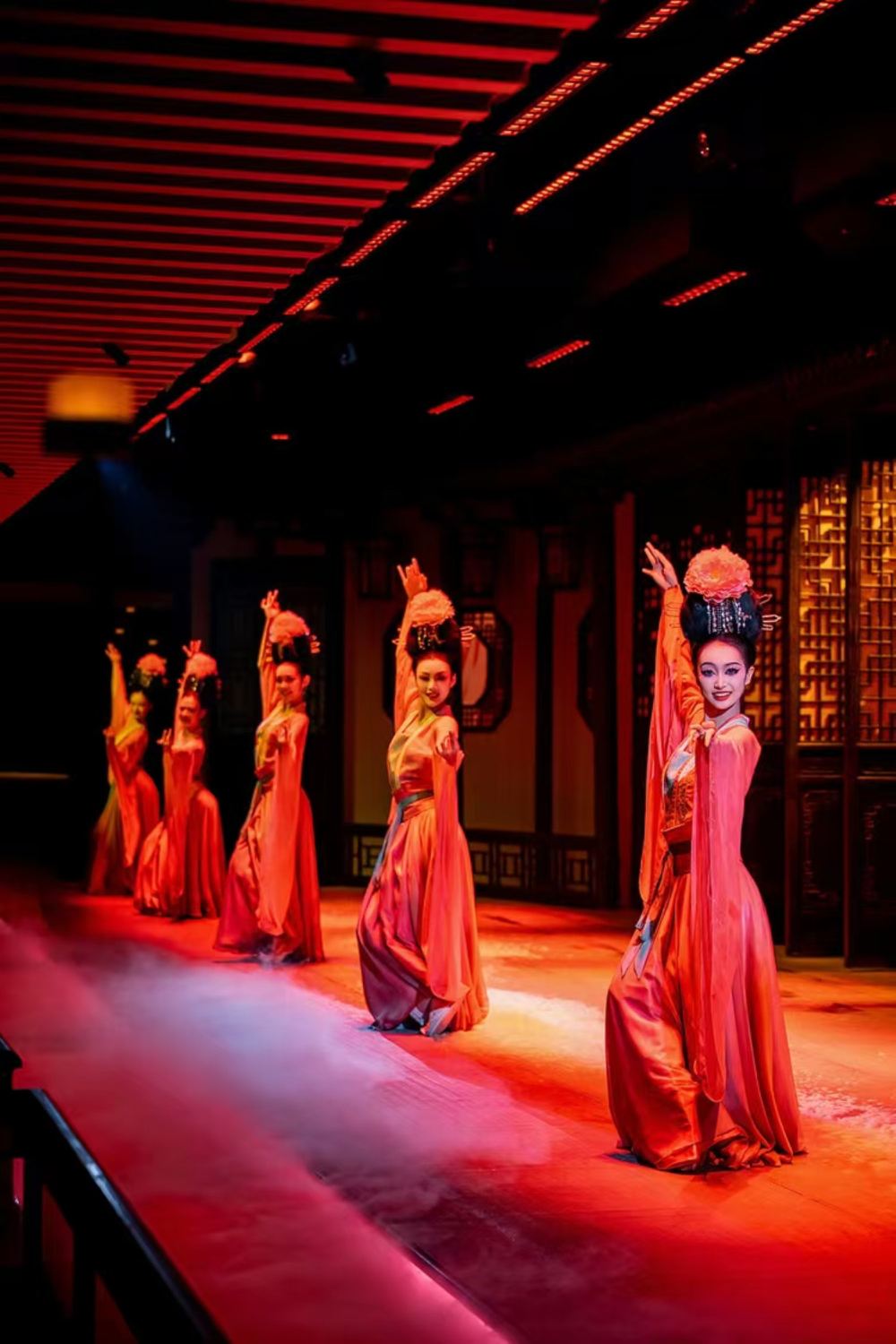 - Dim corridors accentuated by soft pink light, red-clad dancers in formation with flowing sleeves, mist drifting across the steps - the atmosphere is perfectly set to recreate the ceremonial grandeur of imperial banquets.