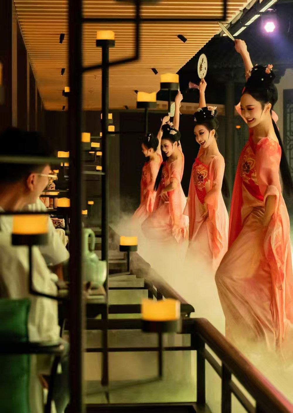 - Warm orange light envelops the long staircase as colorfully dressed dancers and attendants stand in rows to pay homage. Amidst the misty haze, the solemnity and grandeur of the imperial banquet are fully displayed.
