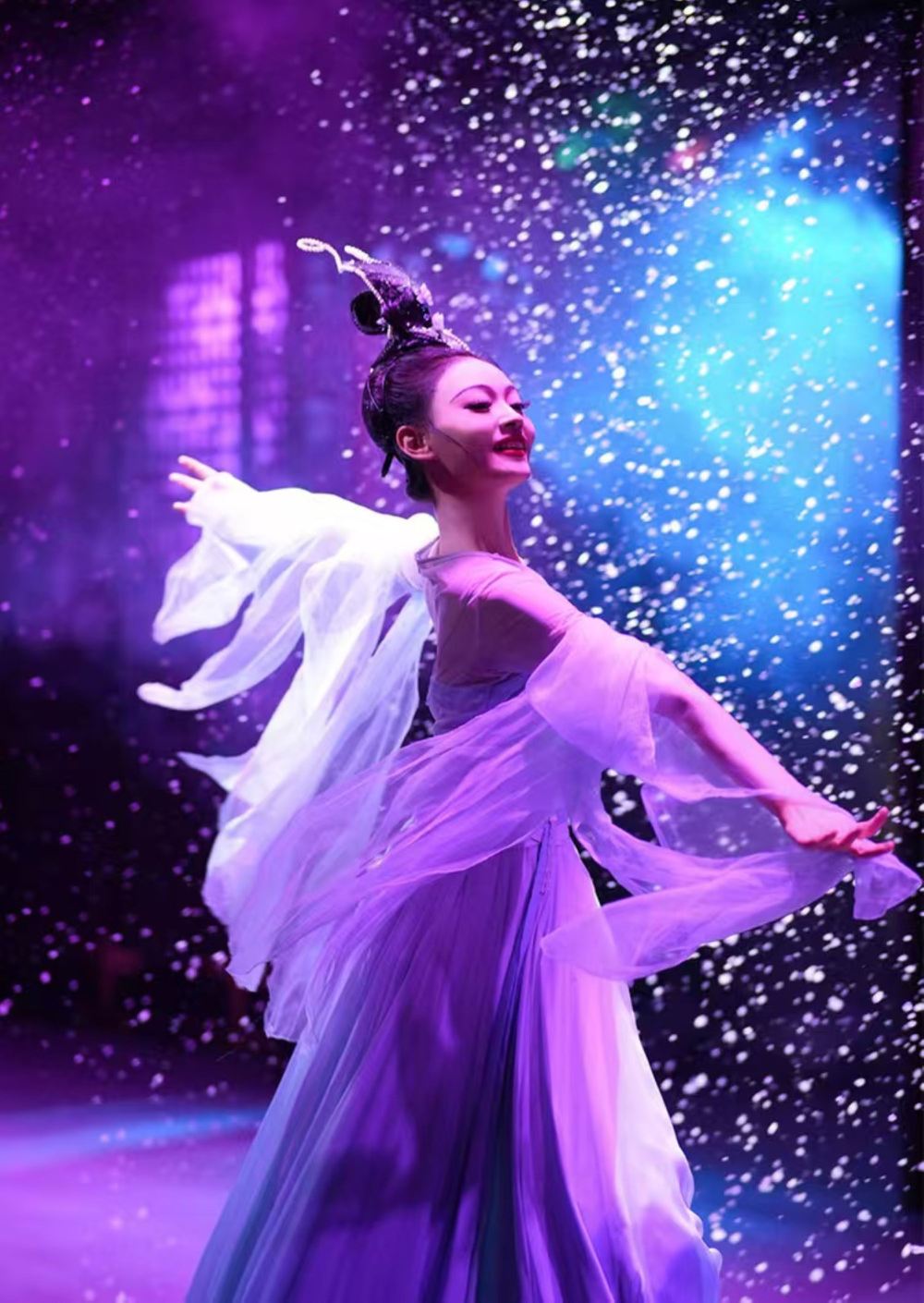 - Against a backdrop of deep blue starry curtains, dancers in white and purple costumes twirl gracefully, their ethereal movements weaving a dreamlike palace dance scene under the interplay of light and shadow.