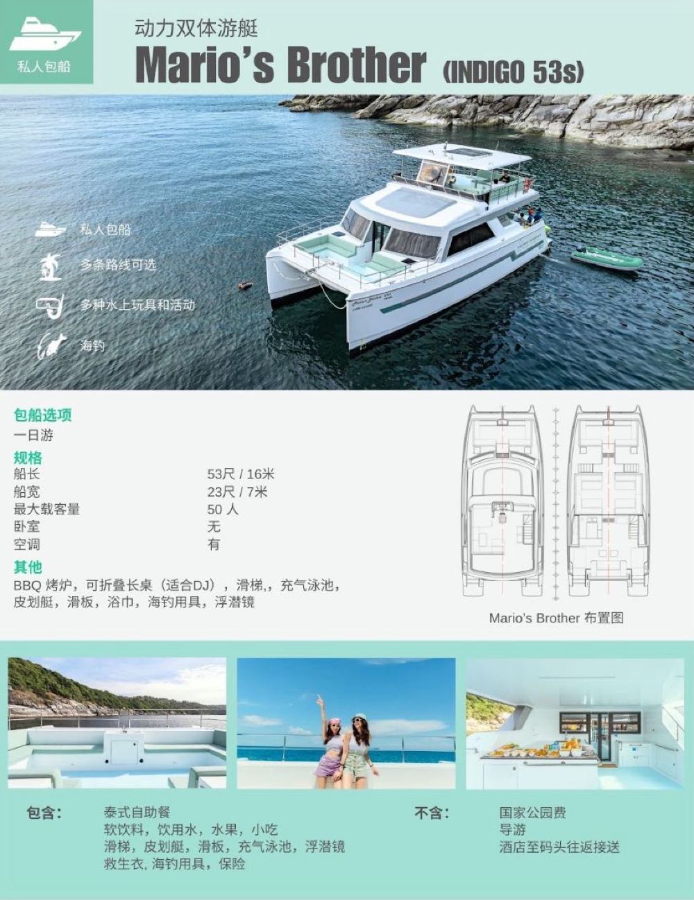 Charter a yacht in Phuket and set sail on the 53-foot "Mario Brothers" for an exclusive Phuket sailing adventure! Comfortably accommodating up to 50 people, this fully equipped yacht offers professional sea angling gear for a delightful fishing experience amidst the emerald waters, while you take in the breathtaking views of the Andaman Sea.