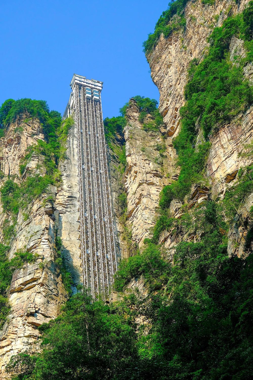 ▲ The Bailong Elevator, with a vertical height difference of 335 meters and an operating height of 326 meters, consists of a solid shaft inside the mountain and a derrick attached to the mountain. Three elevators run side by side, each made entirely of transparent glass. While riding the elevator, you can admire one of Zhangjiajie's most spectacular sights through the glass: the Gathering of Divine Warriors. Located directly opposite the Bailong Elevator, this formation is composed of dozens of relatively independent stone peaks. Major attractions like the Golden Whip Stream, Yuanjiajie Scenic Area, and Tianzishan are seamlessly connected. The elevator ride takes just 2 min to reach the mountaintop Yuanjiajie Scenic Area.