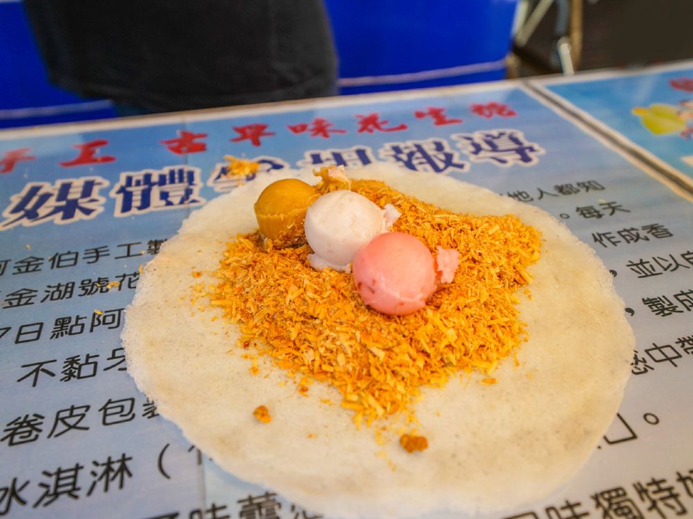 ▲Yilan offers a variety of delicious foods. Along this route, not only are the scallion-related snacks exceptionally tasty, but near the entrance of Meihua Lake, you can also find peanut powder ice cream. Foreign friends who haven't tried it before can buy one for a unique taste experience.