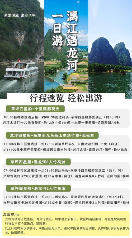 1. Children: Children under 90cm cannot take the Li River Scenic Area bamboo raft; children over 1.3m will be charged the adult price.
