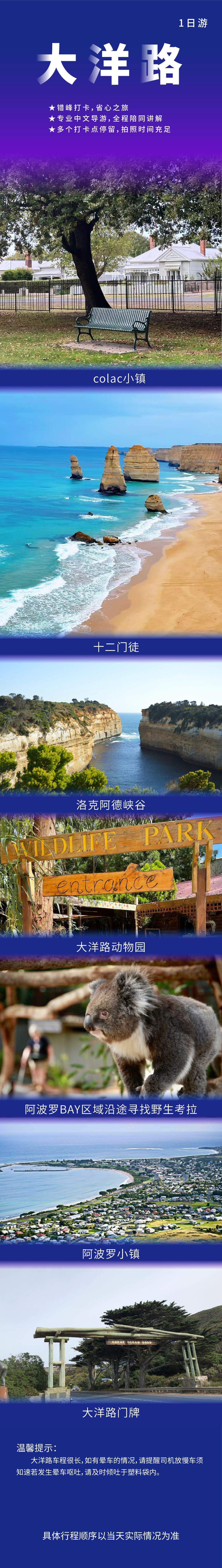This iconic tourist route winds through pristine beaches weathered by sea winds, picturesque towns, historically significant gold mining areas, magnificent mountains, rainforests, and national parks. Note: The itinerary sequence may be adjusted based on actual conditions, and all attraction stop durations are approximate. The final schedule is subject to the guide's arrangements.