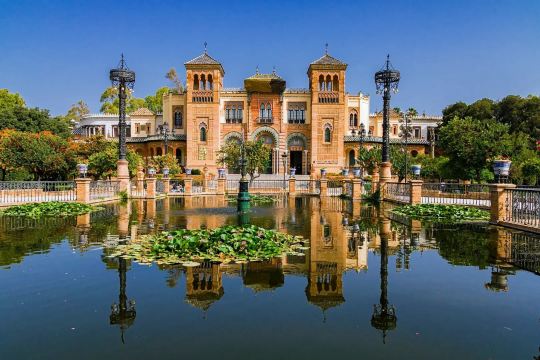 ▲ Parque de Maria Luisa is one of the largest parks in Seville, covering over 400,000 square meters. Originally a romantic-style garden donated by Princess Luisa de Orleans, it was renovated for the 1929 Ibero-American Exposition. The semicircular España Square is located on the eastern side of the park, paved with brick and ceramic tiles. A semicircular canal separates the square from the surrounding buildings, where visitors can enjoy boat rides. Along the canal, benches for resting are decorated with historical scenes from various regions of Spain. A military museum stands adjacent to the square. At the southern end of the park lie three buildings constructed for the Ibero-American Exposition, each representing Spain's outstanding architectural styles: Neo-Gothic, Mudejar, and Plateresque.