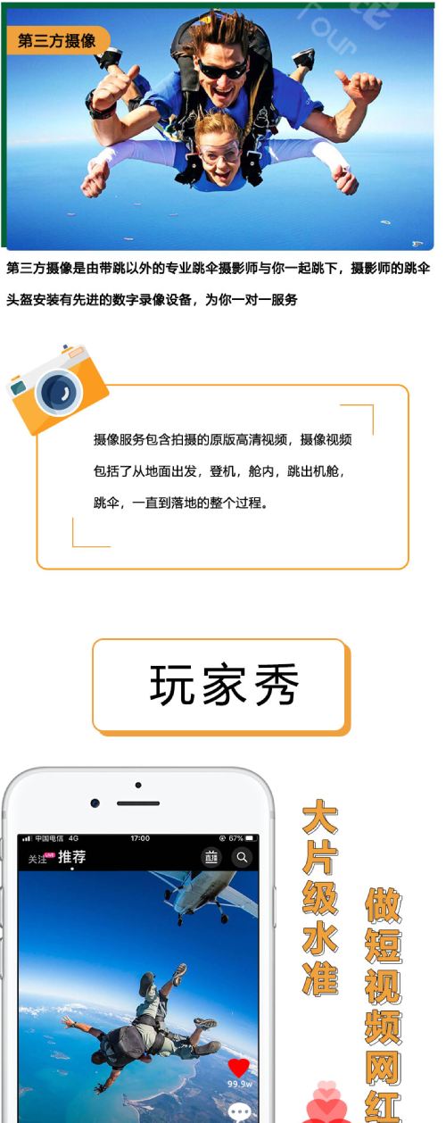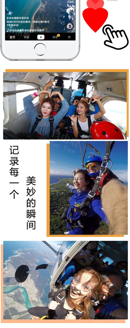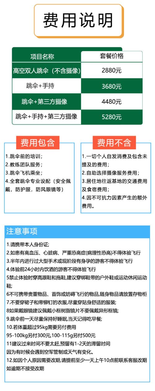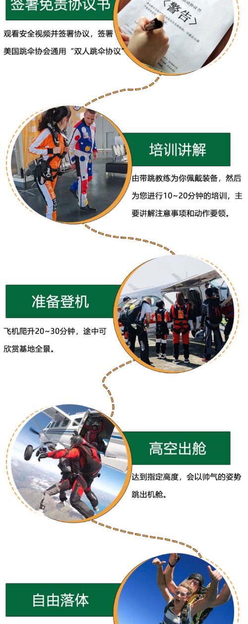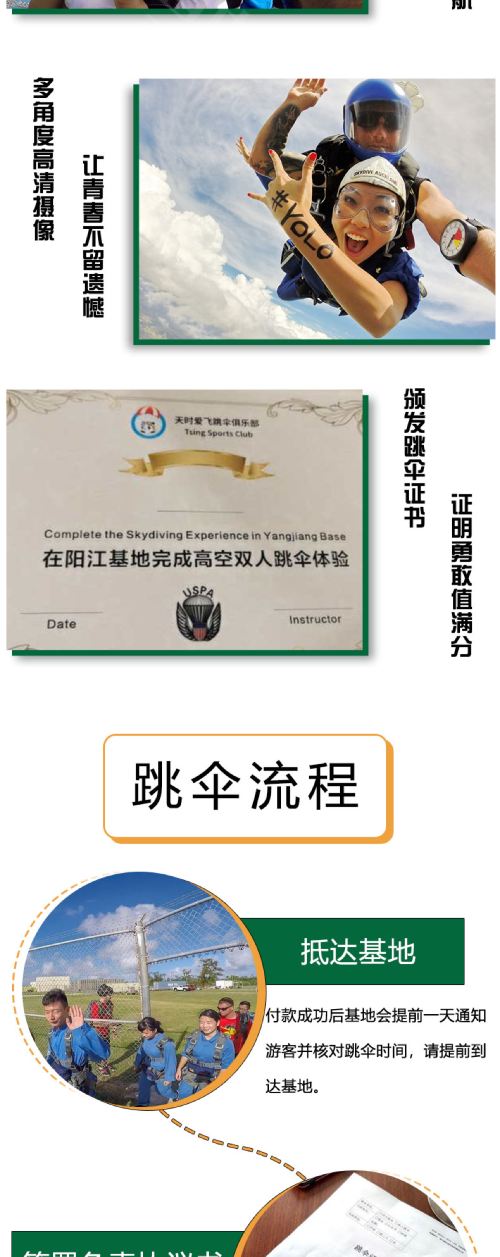 6. It is recommended not to consume excessive alcohol the night before skydiving and avoid eating too much before the activity. Skydiving is not allowed within 24 hours after diving. Pregnant women, individuals with a history of heart or brain diseases, severe hypertension, or other special conditions cannot participate in skydiving activities. If feeling unwell during the activity, please inform the instructor immediately.