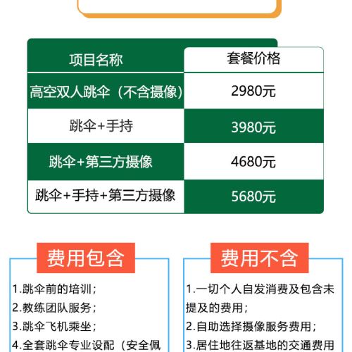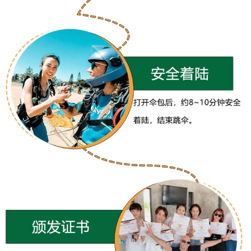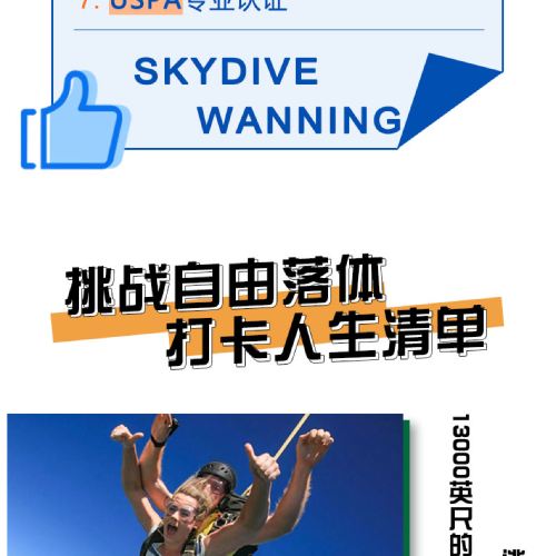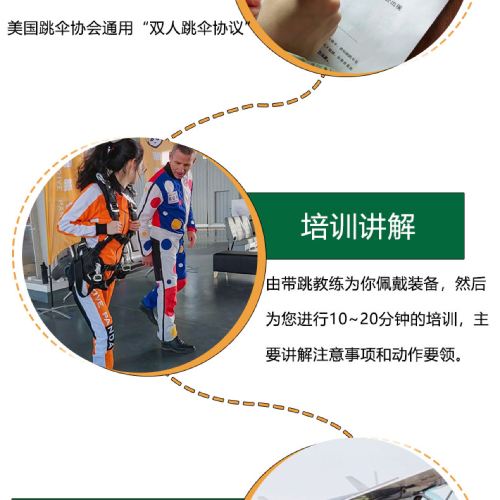 6. It is recommended not to consume excessive alcohol the night before skydiving and avoid eating too much before the activity. Skydiving is not allowed within 24 hours after diving. Pregnant women, individuals with a history of heart or brain diseases, severe hypertension, or other special conditions cannot participate in skydiving activities. If feeling unwell during the activity, please inform the instructor immediately.