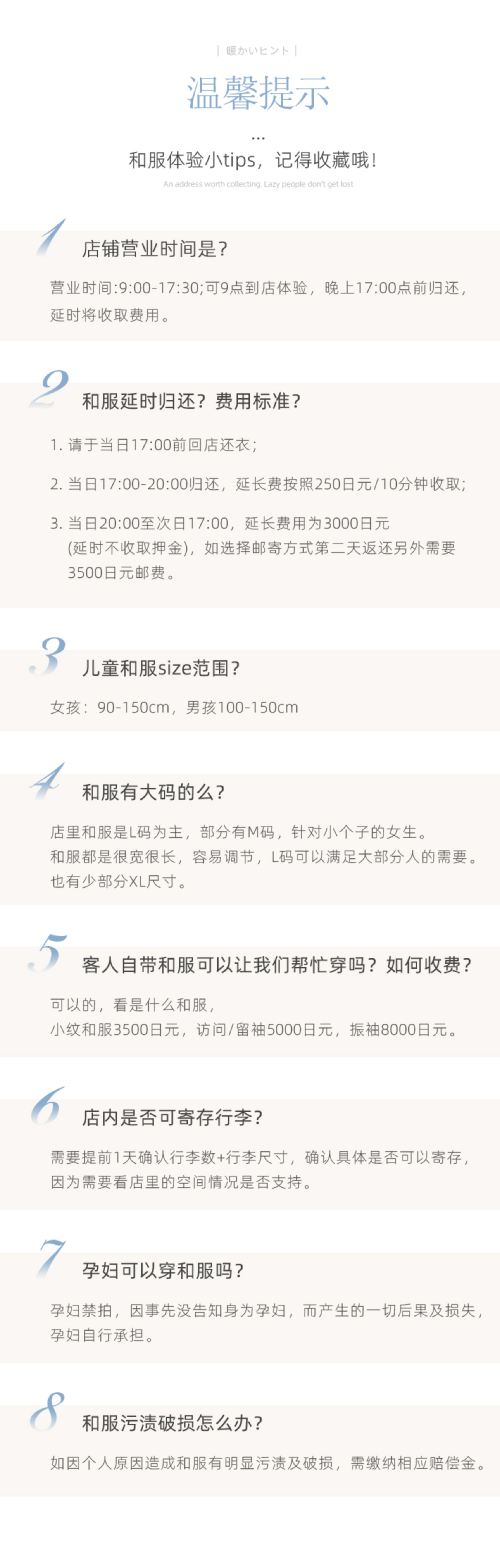 5. Pregnant women are prohibited from taking photos. The kimono shop does not accommodate pregnant women for in-store experiences. Pregnant women should self-assess. Any consequences or losses arising from not disclosing pregnancy status in advance will be solely borne by the pregnant individual. Please be advised~~~